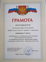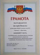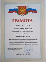 Бондаренко Алексей занял второе место в муниципальном этапе Всероссийского конкурса детско-юношеского творчества по пожарной безопасности "Неопалимая купина" в номинации "Декоративно-прикладное искусство". Дегтярёв Всеволод занял 1 место в муниципальном этапе Всероссийского конкурса детско- юношеского творчества по пожарной безопасности "Неопалимая купина" в номинации "Технические виды творчества". Коллективная работа воспитанников МБДОУ детского сада №9 "Зорюшка" х. Николовка заняла 1 место в муниципальном этапе Всероссийского конкурса детско-юношеского творчества по пожарной безопасности "Неопалимая купина" в номинации "Декоративно-прикладное искусство".