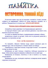 Наступление весны и потепление приводит к таянию снежного покрова и льда. Тонкий лед является одной из самых распространенный опасностей, которые приводят к гибели людей. В целях предупреждения происшествий на водных объектах, а также пропаганды безопасного поведения в период весеннего паводка в детском саду №9 были проведены инструктажи безопасности с детьми и их родителями на тему: «Осторожно! Тонкий лед!».